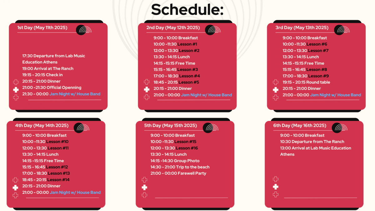 Transportation by bus from Athens to the Ranch (100 km) and back is included in the price. The bus will depart from Athens at 17.30 on the first day of the event and will depart from the Ranch to Athens at 10.30 on the last day the event is held.